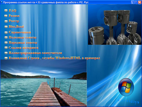 Программа для облегчения поиска всевозможных справок, описаний, инструкций, полезных советов, связанных с эксплуатацией компьютера и программ. В данной программе всё собрано в одном меню. Посмотрите содержание программы и сами всё поймёте.