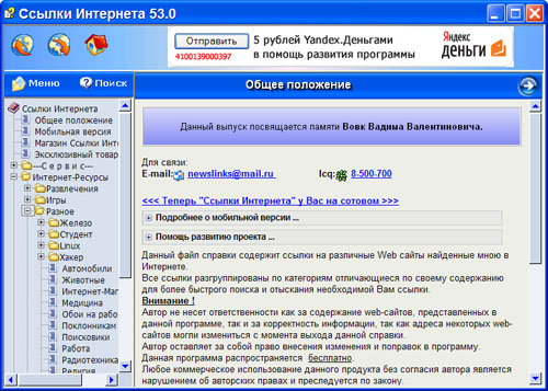 Раздел "Ссылки интернета" (около 2000 ссылок)