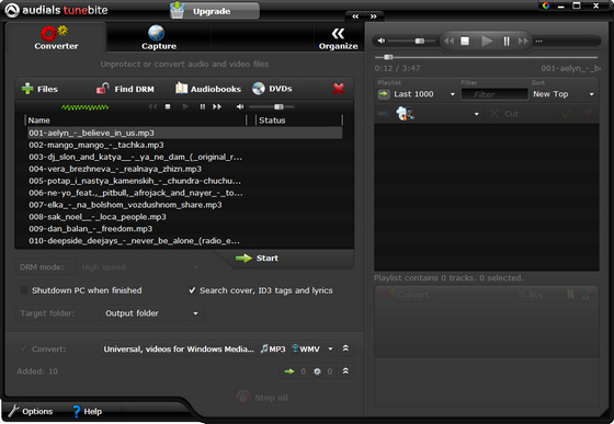 Tunebite - программа, позволяет делать копии с музыкальных файлов, защищенных от копирования. Применяемые технологии цифрового управления авторскими правами (DRM) не дают возможности ни конвертировать их в MP3, ни записывать на компакт-диск, ни проигрывать где-либо, кроме того компьютера, на который этот файл был закачан. Программа позволяет записывать всё, что бы вы ни закачали на компьютер в защищённых цифровых форматах. Возиться с настройками этой программы не нужно, она автоматически определит необходимые для записи параметры звуковой карты. Кроме всего перечисленного, данная программа позволяет записывать защищенное аудио и видео на CD/DVD, изготавливать рингтоны для мобильных телефонов и переносить файлы на мобильные устройства.