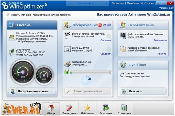 Ashampoo WinOptimizer - новая 8ая линейка пакета программ, позволяющего оптимизировать операционную систему за счет ее настройки и очистки. Включает в себя утилиты для очистки жесткого диска и системного реестра, модуль для обеспечения защиты личной информации путем поиска и удаления файлов и данных, оставшихся после интернет-cepфингa, утилиту для оптимизации интернет-соединения, модуль для настройки программ, автозагружаемых одновременно с запуском системы, а также модули для поиска и удаления ненужных файлов DLL, для безвозвратного удаления данных и для шифрования файлов. Кроме этого, программа позволяет переназначать ассоциации файлов, шифровать и расшифровывать файлы, а также безвозвратно их удалять. Наконец, возможна настройка параметров системы и ее оптимизация за один клик. В шестой версии программы появилось немало новых возможностей, новые модули, включая новый антишпионский модуль и менеджер контекстного меню Windows, а также множество улучшений и исправлений.