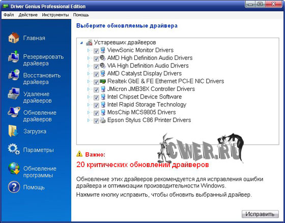 - Идентификация неизвестных устройств, поиск и обновление драйверов, автообновление драйверов через интернет (только версия Professional).