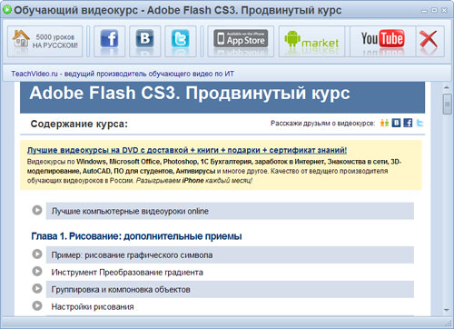 Вы научитесь создавать яркие, запоминающиеся Веб-ресурсы, сочетающие в себе растровые изображения с гибкостью векторной графики, анимацией и звуком. Отдельные разделы посвящены работе с графикой и анимацией, а также настройке программы. Файл представляет собой удобную оболочку, после установки которой, вы сможете просматривать видеокурс в хорошем качестве и разрешении.