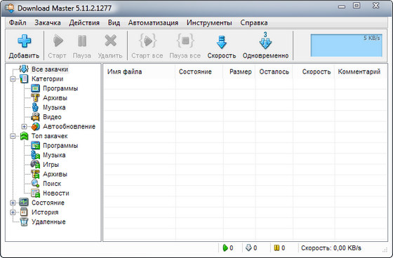 Download Master позволяет значительно повысить скорость закачки файлов через Интернет с использованием HTTP, HTTPS и FTP протоколов. Для этого используется разбиение файла на потоки, которые закачиваются одновременно. Программа также поддерживает докачку файла с текущей позиции после обрыва связи.