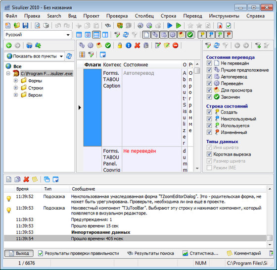 Локализация программ позволяет вашей разработке выйти на более широкий рынок потребителей, тем самым увеличивая ваши денежные доходы, популярность вашего программного обеспечения и приток новых пользователей. С помощью данной полезной, простой и удобной программы вы сможете сделать быстрый перевод своего ПО на множество других языков, затратив минимум усилий, времени и получая отличный конечный результат. Локализация программного обеспечения, с помощью данной программы, проходит за три этапа: первый шаг - сканирование приложения и определение всех участков текста. Sisulizer может работать непосредственно с C++ Builder, Delphi, Visual C++, Visual Basic, Java, или Windows двоичном файле, или с XLIFF. Sisulizer работает визуально с HTML и XML. Sisulizer может также отбирать текст из текстовых файлов и баз данных. Sisulizer может также поддерживать мобильные приложения. Sisulizer поддерживает .NET для Смарт устройств, Pocket PC, Windows mobile, Symbian, и J2ME; второй шаг - перевод текста, с использованием встроенного визуального редактора; третий шаг - построение локализованной версии.