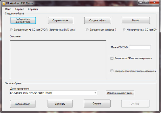 RT Windows ISO Maker - программа для создания, сохранения и записи загрузочных образов операционных систем Windows XP/Vista/7.