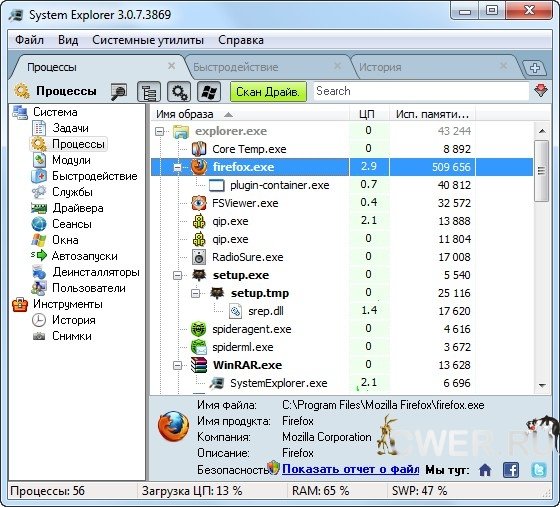 Не пропустит System Explorer и процессы, использующие сеть. Из раздела "система" можно деинсталлировать переставшую быть нужной программу, изменить параметры автозапуска ОС, просмотреть драйвера устройств. В общем, если вас не устраивает стандартный диспетчер задач, попробуйте System Explorer.