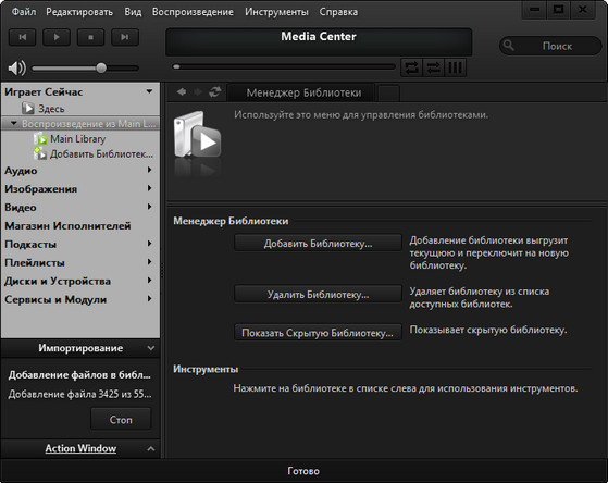 При помощи J. River Media Center Вы сможете, с помощью компьютера, управлять всеми подключенными к нему мультимедиа-устройствами. С помощью этой программы вы сможете копировать музыку на портативные цифровые плееры, перемешать цифровые фотографии с камеры в цифровую библиотеку медиа-центра, записывать из аудио-файлов музыкальные диски, записывать любимые телепрограммы и просматривать их на ТВ. Мультимедийный центр позволяет включить в разных комнатах в одно и то же время разную музыку.
