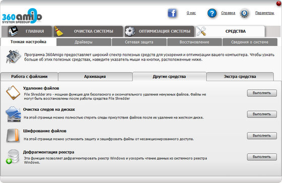 Думаете, что Ваш ПК слишком медленный? 360Amigo System Speedup может быстро вычислить и исправить широкий спектр ошибок и ускорит работу Вашего медленного ПК. 360Amigo System Speedup определяет и удаляет на Вашем компьютере все неиспользуемые файлы, оставшиеся от неправильной установки / удаления программ, он оптимизирует Ваш Windows, тем самым ускоряя время запуска системы. Кроме того, эта программа препятствует запуску вредоносных процессов на Вашем ПК. Также, она удаляет следы Вашей он-лайн активности, а именно историю просмотра, cookie-файлы, временные файлы, журнал регистраций, неверные ссылки и многое другое. Но самое главное в этой программе это то, что она мало весит, невероятно быстра и действенна (обычно её прогон занимает менее минуты). 360Amigo System Speedup выжмет максимум из Вашего ПК и сделает его снова как новым. Доступными функциями и возможностями этой программы смогут наслаждаться как новички, так и опытные пользователи.