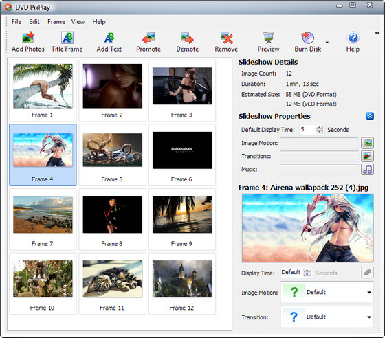DVD PixPlay - программа для создания из картинок, видео и музыки, дисков формата DVD, VCD или SVCD. Поддерживает все популярные форматы графики (JPEG, JPEG2000, GIF, BMP, PNG и т.д.), форматы фотокамер (CRW, CR2, NEF и т.д.), звуковые (MP3 и WAV) и видео форматы (AVI, MPEG). Есть возможность добавления фоновой музыки и разных эффектов для последующего просмотра на DVD проигрывателе. Содержит более 160 графических эффектов.