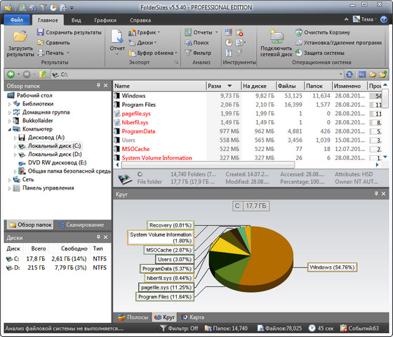 Эта программа позволит вам провести проверку жестких дисков на наличие на них свободного места. Если вы никак не можете понять, почему места осталось так мало, запустите FolderSizes Pro, и программа создаст для вас полный отчет. Программа сгенерирует диаграммы, которые наглядно покажет, какие папки занимают больше всего места. Среди возможностей программы: Распечатка отчетов, экспорт их в HTML; Экспорт диаграмм в файлы JPEG, PNG, BMP или TIFF; Система создания отчетов по типам файлов, которые занимают больше всего места.