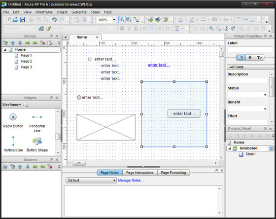Интерфейс программы аналогичен Microsoft Office 2003. "Blank" для создания веб - страниц похож на формы в ресурс - билдерах, подобных используемому в Delphi. Проектирование потоков диаграмм сходно с аналогичным проектированием в Microsoft Visio. В результате генерирования прототипа получается статический сайт, широко использующий javascript. Качественная документация и учебные материалы в свободном доступе на сайте производителя. Axure RP Pro может оказаться очень полезным средством для проектирования небольших, но функционально - насыщенных проектов, а также больших проектов на начальном этапе.
