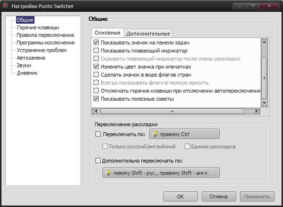 - Возможность изменить стандартные системные комбинации клавиш для смены раскладки