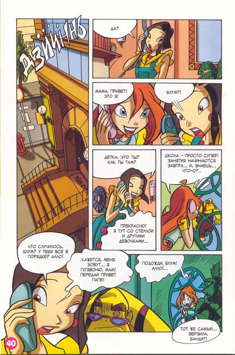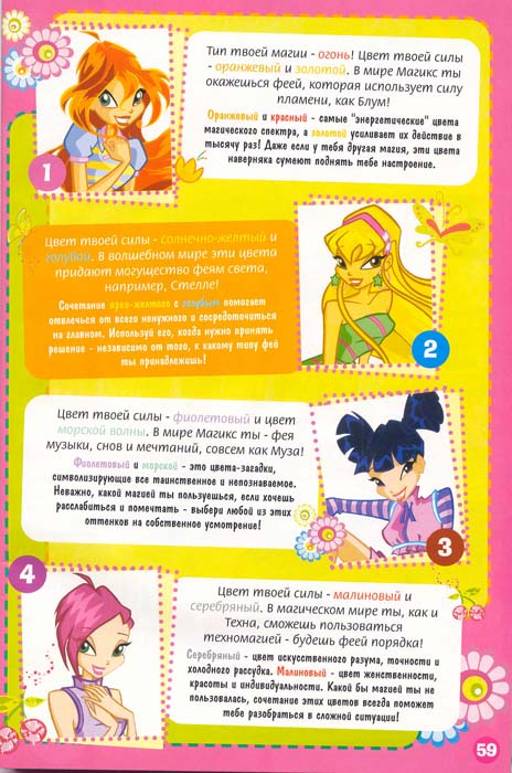Комиксы по мультсериалу Школа Волшебниц. Повествуют о приключениях 6 смелых фей: Блум, Флора, Стелла, Муза, Техна и Лейла - учатся в школе Алфея, дружат с мальчиками и спасают волшебный мир Магикс от злых существ.