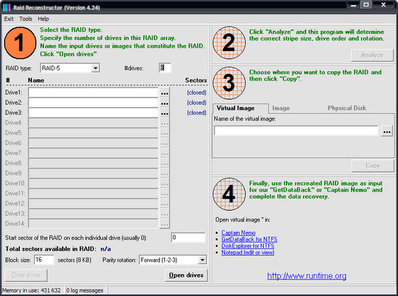 Runtime Raid Reconstructor - мощная программа с большим набором функций и инструментов для восстановления данных с поврежденных дисковых массивов (RAID) 5 уровня. RAID Reconstructor Recover Data from a broken RAID Level 5 or 0 Array.