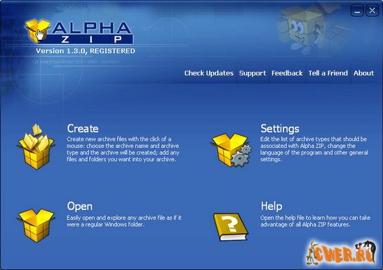 C первых минут работы, программа радует приятным пользовательским интерфейсом и персонажем – символом разработчиков, который похож на квадратные штаны Cпанчбоба, обзаведшиеся глазами с озорным взглядом, улыбкой и именем Alpha Zip. Программа поддерживает работу со следующими форматами архивов: ZIP, RAR, CAB, BH, JAR, LHA, LZH, TAR, TAR.GZ, ZOO, ACE, ARC, ARJ, 7z. Естественно, поддерживается создание самораспаковывающихся архивов.