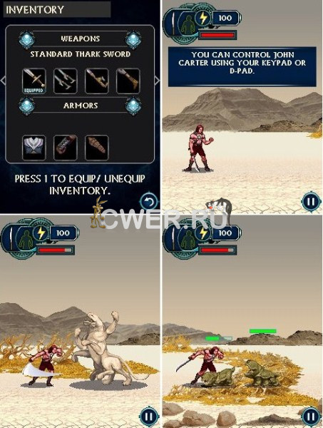 Игра перенесёт вас в мир приключений Джона Картера по мотивам одноименного кинофильма. Джон - герой и ветеран гражданской войны в США, который случайно попадает на планету Барсум. Победите вместе с Джоном грозных врагов и поддержи его стремление спасти цивилизации на Барсуме. Размеры экранов: 128x128, 128x160, 176x220, 240x320, 320x240, 352x416, 360x640.