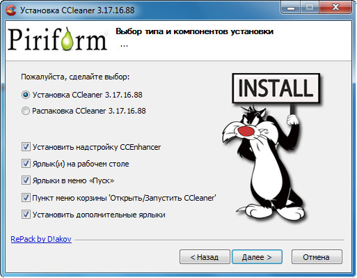 • Также возможен выбор каталога для установки: После всех ключей необходимо добавить /D=%путь% Пример: файл_установки.exe /S /inst /D=C:\CCleaner