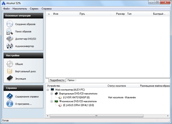 Alcohol 52% - широко известная программа для эмуляции CD/DVD приводов, которая позволяет создавать точные копии дисков и загружать их в виртуальные накопители. Бесплатная версия приложения позволяет создать 6 виртуальных накопителей, каждый из которых может работать с образами дисков на скорости 200x. Поддерживается большое количество разнообразных форматов образов дисков: MDS, CCD, BIN, CUE, ISO, NRG, CDI, BWT и другие, возможна регистрация пользовательских расширений файлов-образов. Программа будет полезна всем, кому часто приходится вставлять и вынимать различные CD/DVD диски. С её помощью можно разместить все часто используемые носители в виде образов на жёстком диске вашего компьютера.