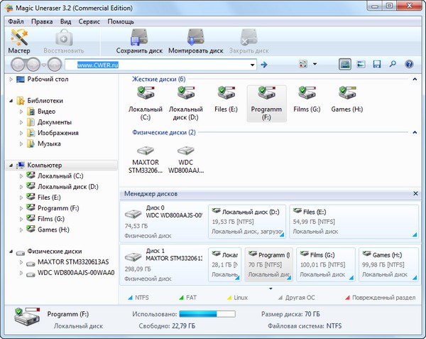 Magic Uneraser от East Imperial Soft предлагает восстановление файлов всех типов, включая документы, фотографии, mp3 и ZIP файлы. Эти файлы могли быть утеряны при очищении корзины, удалении через командную строку, после форматирования или при удалении без использования корзины.