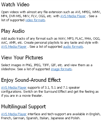 AVS Media Player - это полнофункциональный программный медиаплеер, имеющий все функции и элементы управления обычного аппаратного плеера. Простой дружественный интерфейс программы дает пользователю возможность начать воспроизведение разных типов медиафайлов без дополнительных программ и специальных знаний.