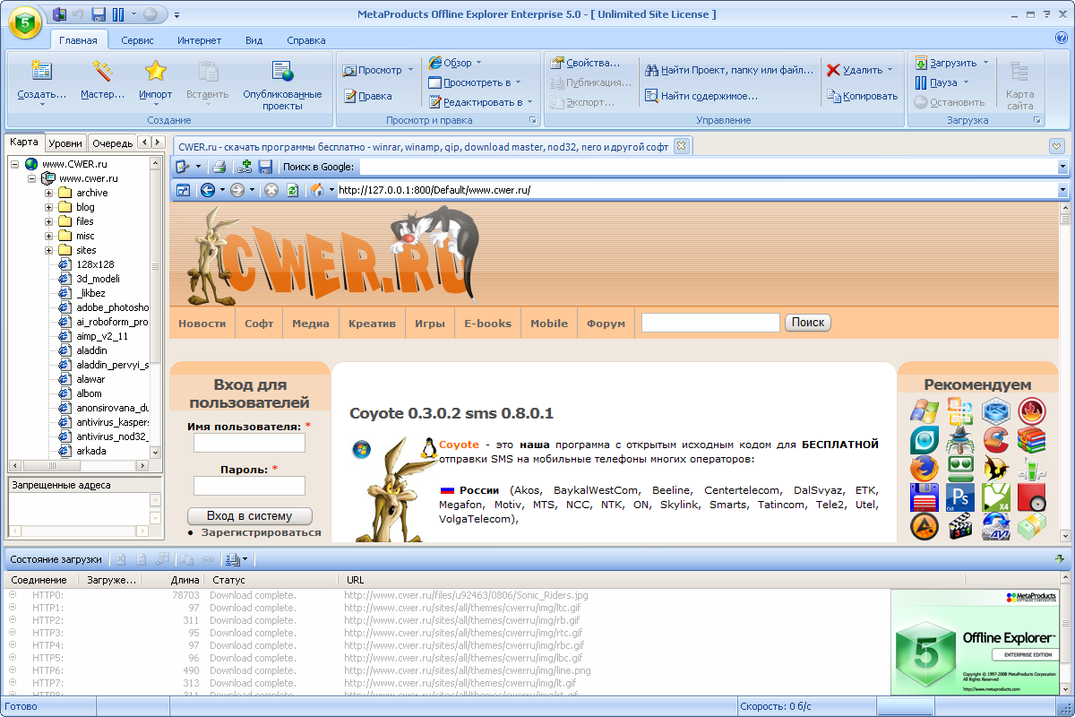 Offline Explorer - мощнейшая программа, позволяющая скачивать как отдельные файлы, так и целые веб-сайты (HTTP, FTP и HTTPS) на жесткий диск для их последующего офф-лайн просмотра как на отдельном компьютере, так и пользователями целой локальной сети. Используя Offline Explorer Enterprise, вы можете одновременно качать неограниченное количество выбранных вами Web, FTP и HTTPS сайтов для дальнейшей работы с ними. Offline Explorer Enterprise содержит веб-утилиты для легкого и быстрого редактирования, просмотра или поиска скачиваемых страниц во встроенном веб-браузере.