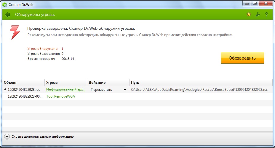 Во время очистки системы от мусора BoostSpeed каким-то образом подхватил активатор Win7 (или его модуль) и поместил его в резервную копию, на которую и ругается Dr. Web.