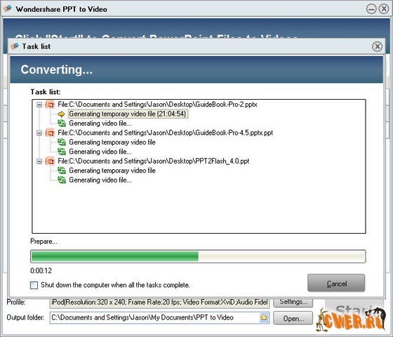 Wondershare PPT to Video это удобный конвертер презентаций PowerPoint в видео. Он поможет сконвертировать презентацию PowerPoint почти в любой видео формат: MPEG, AVI, MP4, WMV, MOV, 3GP в лучшем качестве. Программа поддерживает iPod, iPhone, Apple TV, Zune, PSP, Pocket PC, Black Berry и др. видео форматы.