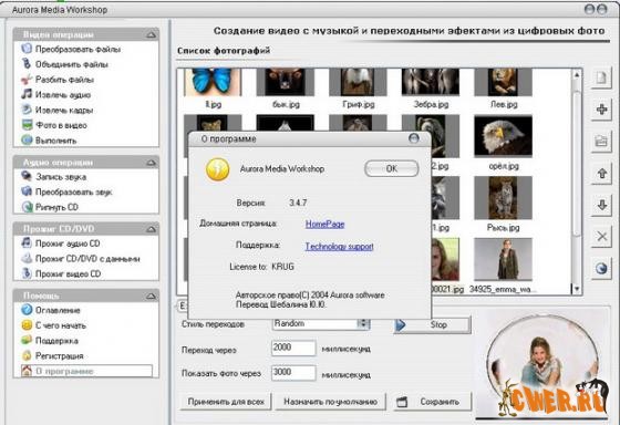 Aurora Media Workshop - это универсальный набор инструментов для выполнения основных операций с аудио- и видеофайлами. Умеет профессионально конвертировать аудио и видео , нарезать и соединять треки, грабить аудио CD в MP3-, WMA-, WAV-форматы, извлекать аудио из видеофайлов, прожигать CD, создавать видео-CD из набора фотографий с эффектными переходами, извлекать кадры (фреймы) из видеофайлов и целиком грабить DVD (VOB, DAT). Поддерживает форматы: AVI, MPEG1, MPEG2, ASF, WMV, VOB, DAT, DivX, XviD, MP3, WMA, WAV, OGG...