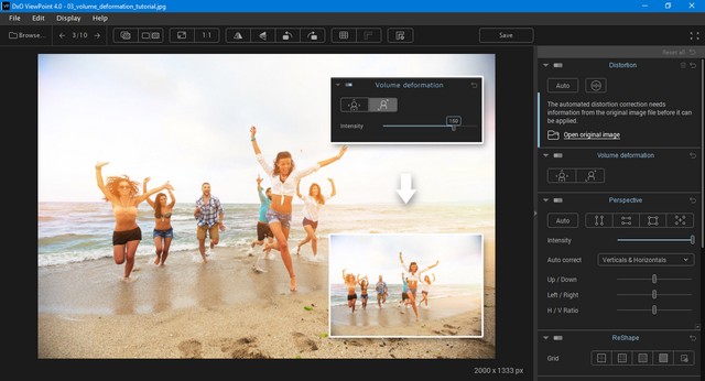 восстановление естественных пропорций людей по краям фотографий в один клик. DxO ViewPoint автоматически корректирует вытянутые лица или искаженные формы тела, которые могут возникнуть при съемке с широкоугольным объективом (явление, известное как "объем анаморфоза"). Эта эксклюзивная функция от DxO Labs, адаптированная к конкретным потребностям, особенно полезна для групп или свадебных фотографий.