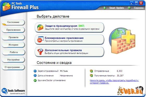 PC Tools Firewall Plus – это бесплатный, простой в использовании, но эффективный персональный брандмауэр для Windows®, защищающий информацию, хранящуюся на Вашем компьютере, от несанкционированного доступа из локальных сетей или Интернета. Контролируя работу различных приложений, Firewall Plus пресекает попытки троянов, бэкдоров, клавиатурных шпионов и прочих вредоносных программ нанести ущерб компьютеру и похитить Вашу конфиденциальную информацию.
