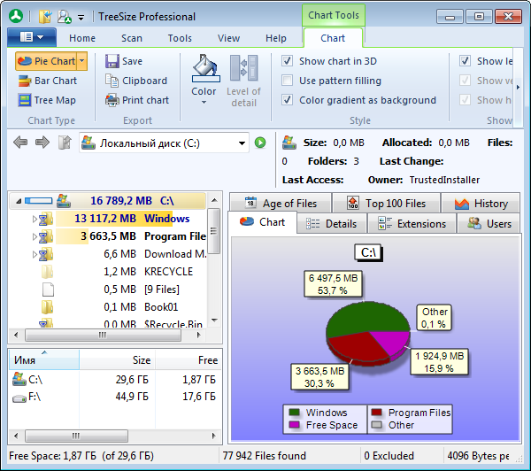 TreeSize Professional показывает дерево находящихся на жестком диске директорий вместе с их размерами, позволяя, при необходимости, распечатать результат. Интегрируется в Проводник Windows, добавляя новую колонку. Программа выдает информацию о количестве файлов в папке, дате последнего доступа, владельце файла и многое другое. Кроме этого, выводит данные в наглядном графическом виде (диаграмма), имеет встроенную систему поиска и экспорт / импорт результатов в XML-файл. Также позволяет вам искать старые, большие, временные и пустые файлы. Поддерживает режим командной строки - это удобно для планирования и ночных запусков. Предусмотрено создание плановой задачи проверки, настройка ее для проверки по некоторому пути и формирование набора отчетов в соответствии со стандартным расписанием.
