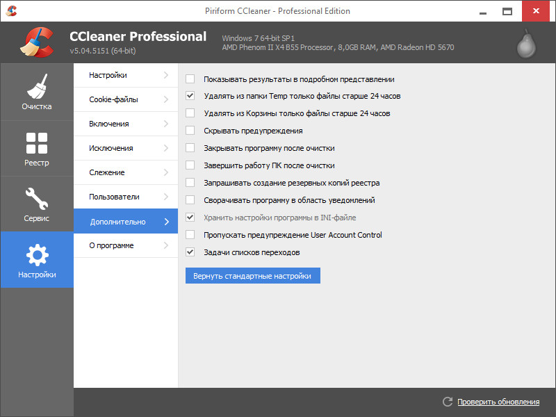 Примечание! Чтобы программа CCleaner запускалась быстрее, необходимо выполнить команду "Дополнительно" > "Облегчить winapp2.ini" в модуле CCEnhancer...