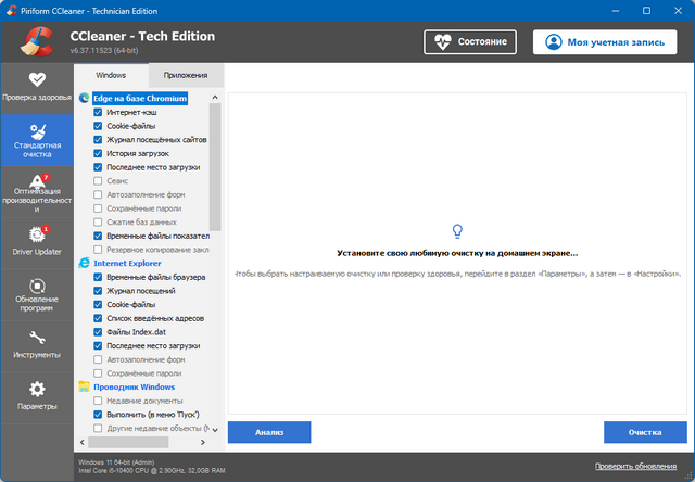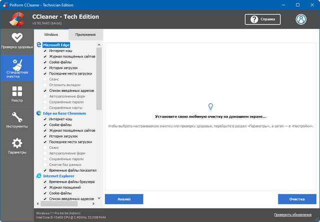 CCleaner - приложение для оптимизации системы и обеспечения безопасности пользователя. Удаляет неиспользуемые и временные файлы, делая работу Windows более быстрой и освобождая место на жестких дисках.