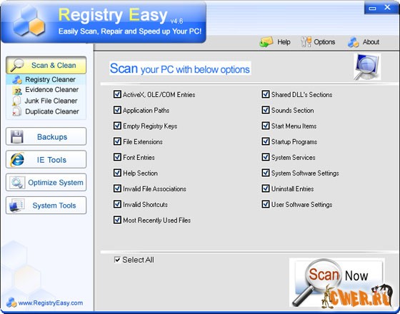 Registry Easy - это программа, предназначенная для очистки реестра и оптимизации операционной системы Windows. Данная программа проверяет Ваш компьютер и легко находит и устраняет причины ошибок, вызывающих проблемы с компьютером. Проверяя системный реестр, программа определит ошибки, связанные с нехваткой загрузочных программ, нехваткой системных шрифтов, недействительными ярлыками, недостающими dll-файлами, неверными инсталляциями программ и неверными драйверами устройств. Кроме того, обнаруженные ошибки могут быть связаны с отсутствием связей между файлами и недостатком файлов помощи. Позвольте программе RegistryEasy очистить Ваш реестр безопасно и эффективно!