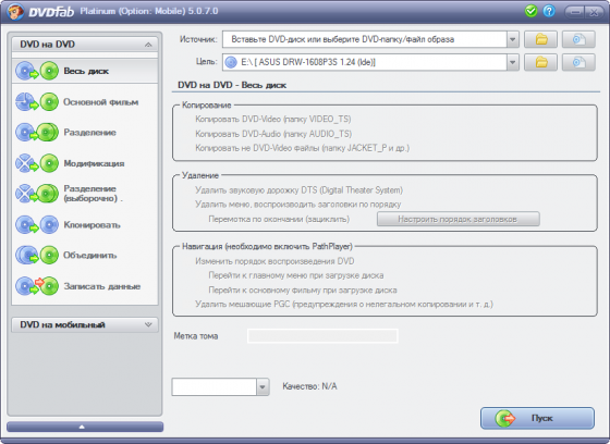 DVDFab Platinum – мощный, многофункциональный программный продукт для копирования DVD дисков с возможностями гибкой обработки видеопотока. Программа является одной из лучших на сегодняшний день, из инструментов для копирования, разбиения, пережатия и конвертирования DVD дисков с фильмами. Снимает все защиты и ограничения с диска и при желании пережмет диск большой емкости и вместит его в обыкновенную пустую DVD болванку с минимальными потерями качества (DVD9->DVD5) или разобъет фильм на два диска с полным переносом его меню, удалит всю рекламу, запишет только фильм и многое другое. Программа имеет интуитивно понятный, мультиязычный интерфейс включая русский.