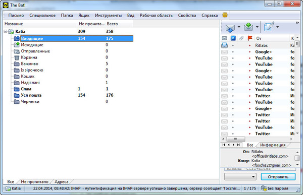The Bat! – общепризнанная система обработки электронных сообщений, которая прекрасно совмещает в себе все качества, необходимые опытному пользователю. Интуитивный интерфейс позволяет пользователям The Bat! приступить к работе сразу после установки. Эффективный механизм фильтрации и сортировки помогает обрабатывать огромные потоки входящей почты, с которыми не справляются другие программы. Системные администраторы по достоинству оценят возможность установки в пакетном режиме, которая позволяет лично контролировать процесс инсталляции The Bat!. Все эти функции, наряду с полностью настраиваемыми инструментами автоматической обработки, избавляют пользователей от рутинной работы.