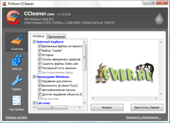 CCleaner - бесплатная программа для оптимизации системы, а также инструмент обеспечения приватности пользователя. CCleaner удаляет неиспользуемые и временные файлы с Вашего компьютера обеспечивая более быструю работу Windows и освобождая место на жестких дисках.