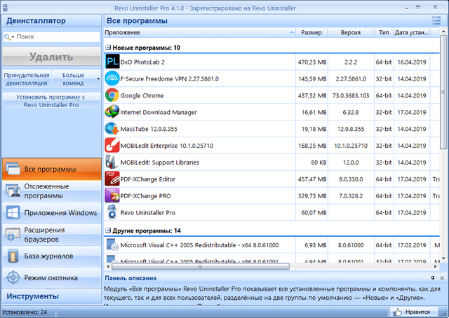 Программа для удаления нежелательных приложений, установленных на вашем компьютере. Revo Uninstaller имеет продвинутый алгоритм сканирования системы до и после инсталляции и позволяет удалять оставшиеся после деинсталляции программы файлы, папки и ключи реестра. Уникальный "режим охотника" предлагает простые, но эффективные инструменты для управления (деинсталляция, остановка, удаление, отмена автозапуска) и получения информации об инсталлированных и/или запущенных программах. Revo Uninstaller также предлагает еще 8 различных утилит для очистки системы.