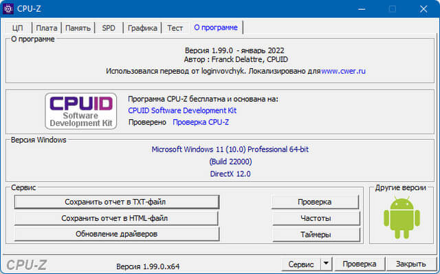 CPU-Z – программа, предоставляющая подробную информацию об установленных в компьютере процессоре, памяти, кэше и материнской плате. Отличается маленьким размером и удобным интерфейсом. Поддерживает практически все типы процессоров и материнских плат. Скачай бесплатно на CWER.ru.