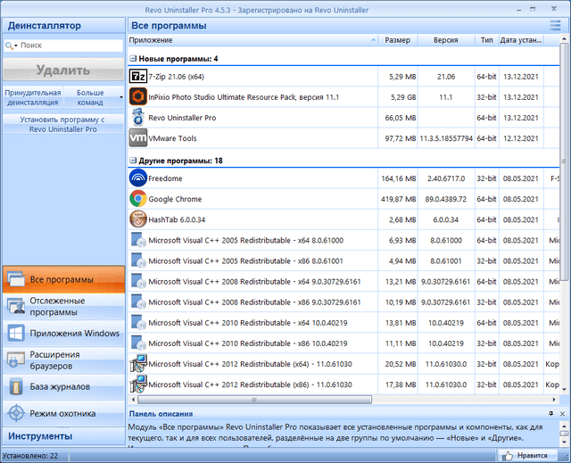 Программа для удаления нежелательных приложений, установленных на вашем компьютере. Revo Uninstaller имеет продвинутый алгоритм сканирования системы до и после инсталляции и позволяет удалять оставшиеся после деинсталляции программы файлы, папки и ключи реестра. Уникальный "режим охотника" предлагает простые, но эффективные инструменты для управления (деинсталляция, остановка, удаление, отмена автозапуска) и получения информации об инсталлированных и/или запущенных программах. Revo Uninstaller также предлагает еще 8 различных утилит для очистки системы.