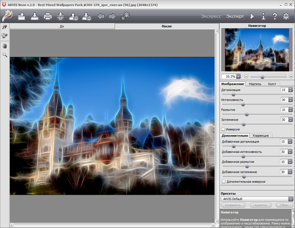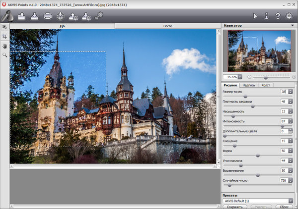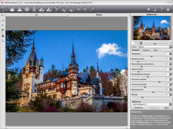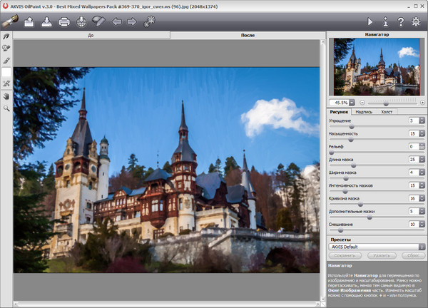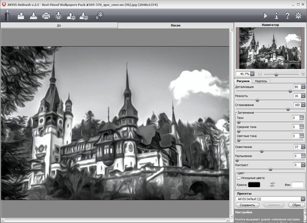AKVIS AirBrush снабжен набором готовых предустановок (40 пресетов), которые облегчают и ускоряют знакомство с программой и упрощают работу. Пресеты можно использовать в готовом виде или же, взяв за основу пресет, изменить параметры по своему вкусу. Импорт/экспорт пресетов позволяет не только сохранить разные комбинации настроек для дальнейшего использования, но и поделиться своими заготовками с другими любителями этой впечатляющей художественной техники.