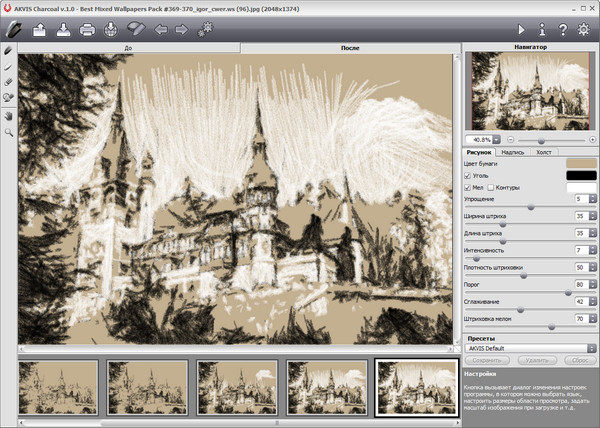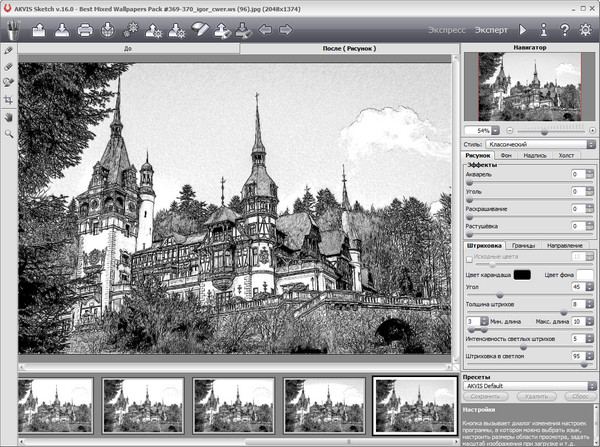 Программа действует как художественный фильтр, изменяя изображение и превращая его в аэрографический рисунок в соответствии с выбранными настройками. Не нужно выполнять сложную ручную работу, прорисовывать линии и детали с помощью инструментов. Просто выберите один из готовых пресетов или поиграйте с настройками эффекта. Программа все сделает сама!