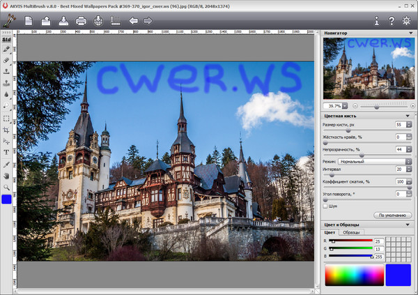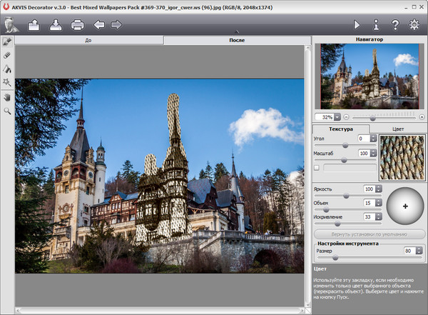 Коллекция кистей программы AKVIS MultiBrush позволяет исправить избранные области фотографии без особых усилий: изменить насыщенность и резкость, размазать объект, перемешивая соседние цвета, тонировать участок, высветляя или затемняя, восстановить и замаскировать, удалить ненужный объект и создать художественный коллаж или рисунок красками.