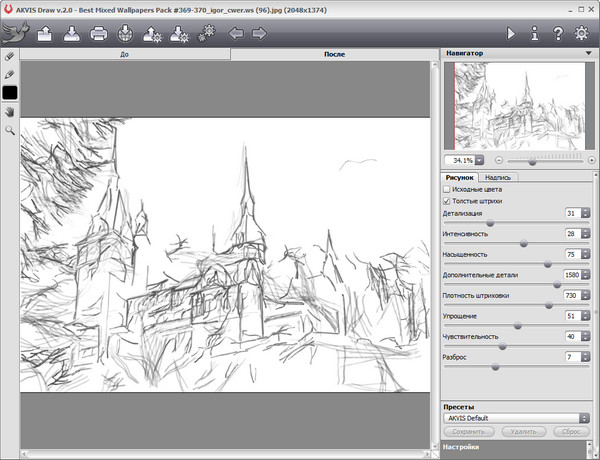 Преобразование происходит автоматически, результат можно отредактировать с помощью с ластика и карандаша: убрать или смягчить линии, добавить дополнительные штрихи. AKVIS Draw поддерживает пакетную обработку данных, что позволяет обработать множество фотографий в автоматическом режиме и создать целый альбом набросков или подготовить раскадровку. Программу можно использовать отдельно для создания авторского эскиза или как один из этапов для подготовки художественного произведения, в сочетании с другими инструментами — ArtWork, OilPaint.