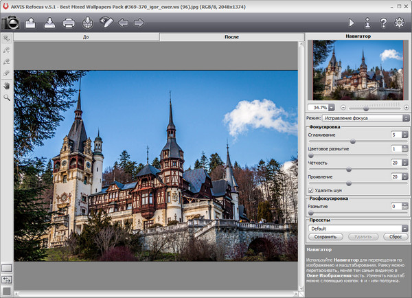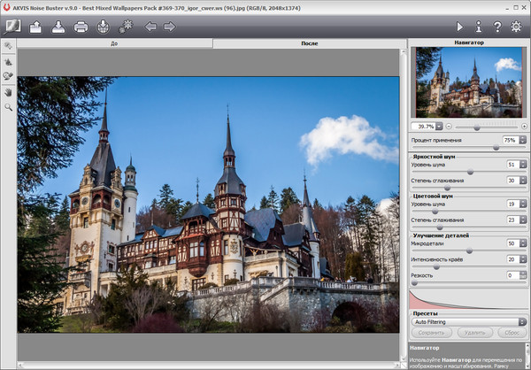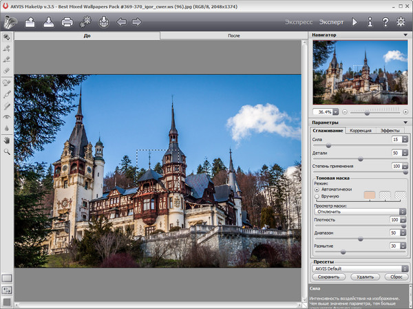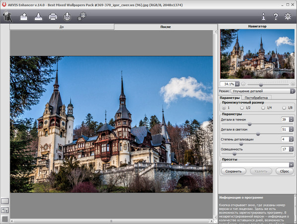Программа работает в трех режимах: Улучшение деталей, Допечатная обработка и Тоновая коррекция. Задача режимов одна — коррекция, но способы исправления изображения, а, соответственно, и результаты — разные. Для разных изображений и разных целей подойдут разные режимы обработки, а в некоторых случаях можно использовать поочередно все.