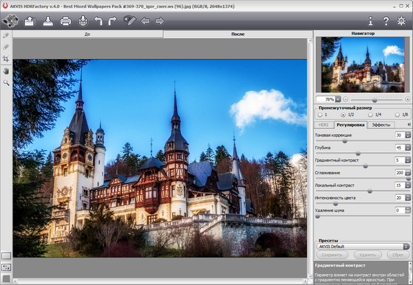 Результат обработки в программе HDRFactory будет ярче, контрастнее, насыщеннее и красочнее, чем позволяет фотокамера, намного ближе к тому, что видит наш глаз, который способен различать больше деталей, чем может зафиксировать фотоаппарат. С помощью AKVIS HDRFactory можно получить как максимально реалистичные фотографии, так и яркие и драматичные стилизованные изображения.