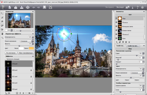 AKVIS LightShop, словно волшебная палочка, помогает воплотить ваши видения. Вы можете населить ночное звездное небо загадочными объектами, добавить на фотографию закат или фейерверк, сияние огней или отблеск свечи. LightShop украсит и разнообразит снимки. Дайте волю своему воображению! Попробуйте программу в деле, начните прямо сейчас. Готовые эффекты, которые идут с программой, помогут вам научиться творить свои собственные свечения. В программе представлено 138 готовых эффектов, которые разбиты на группы (всего 11 групп эффектов).