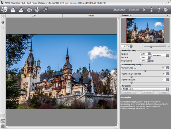 AKVIS Magnifier — программа для изменения размера цифрового изображения без потери качества. С помощью AKVIS Magnifier можно не только уменьшить фотографию, чтобы выложить ее в Интернет или послать друзьям. Magnifier позволяет получить увеличенное изображение высокого качества из маленькой картинки. Программа обеспечивает увеличение снимка в десятки раз без артефактов и ореолов! Изменяя размер изображения, Magnifier восстанавливает границы и детали, борется с jpeg-артефактами.