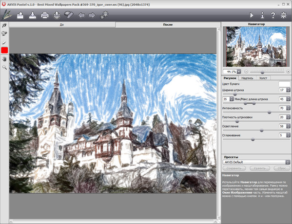 AKVIS Pastel позволяет реализовать творческие идеи. С помощью программы можно создать прекрасную картину, даже не обладая талантом и навыками художника. Можно выбрать один из готовых пресетов либо настроить параметры эффекта по своему усмотрению, создание шедевра гарантированно. Настройки конвертации фотографии в пастель позволяют контролировать процесс и получать разнообразные виды рисунка. Дополнительные инструменты позволяют усовершенствовать полученный результат, изменить направление сформированных автоматически линий, усилить или ослабить эффект пастели на выбранных областях, нанести завершающие штрихи.