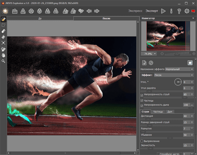 AKVIS Explosion добавляет на фотографии мощные эффекты разрушения и распада на частицы пыли и песка. С помощью программы вы можете создать впечатляющую графику за несколько минут! Explosion позволяет превратить часть изображения в песчаную бурю или взорвать объект на фотографии. Добавьте эффект рассеивания, распыления, имитацию быстрого движения со светящимся следом, создайте волшебный вихрь и другие впечатляющие образы.